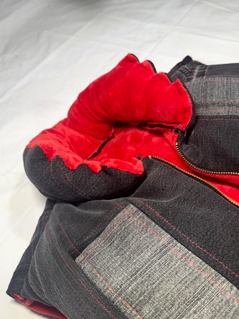 Gradient black to grey denim patchwork puffer vest with vibrant red fluffy inner liner. Features signature step collar design, and split kangaroo pockets on each side of the zipper reinforced with chrome rivets.